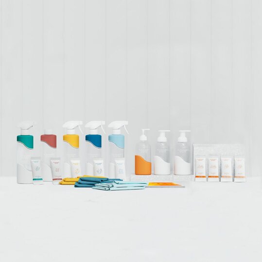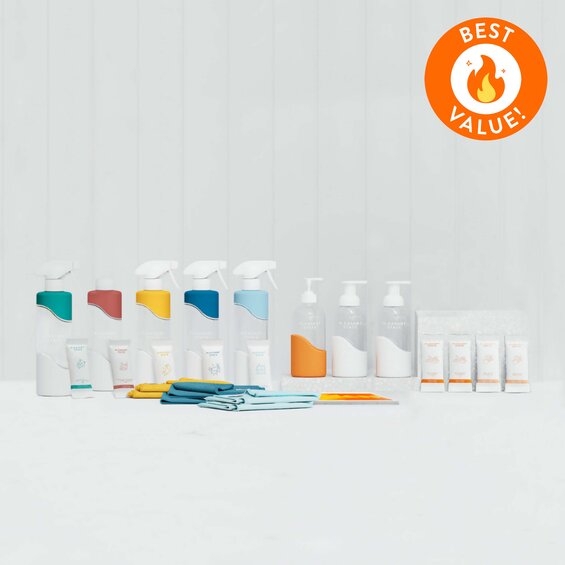 Includes: 8 x refillable glass & silicone bottles, 8 x matching cleaning refills, 6 x microfibre towels & 2 Compostable Swedish Dish Cloths!